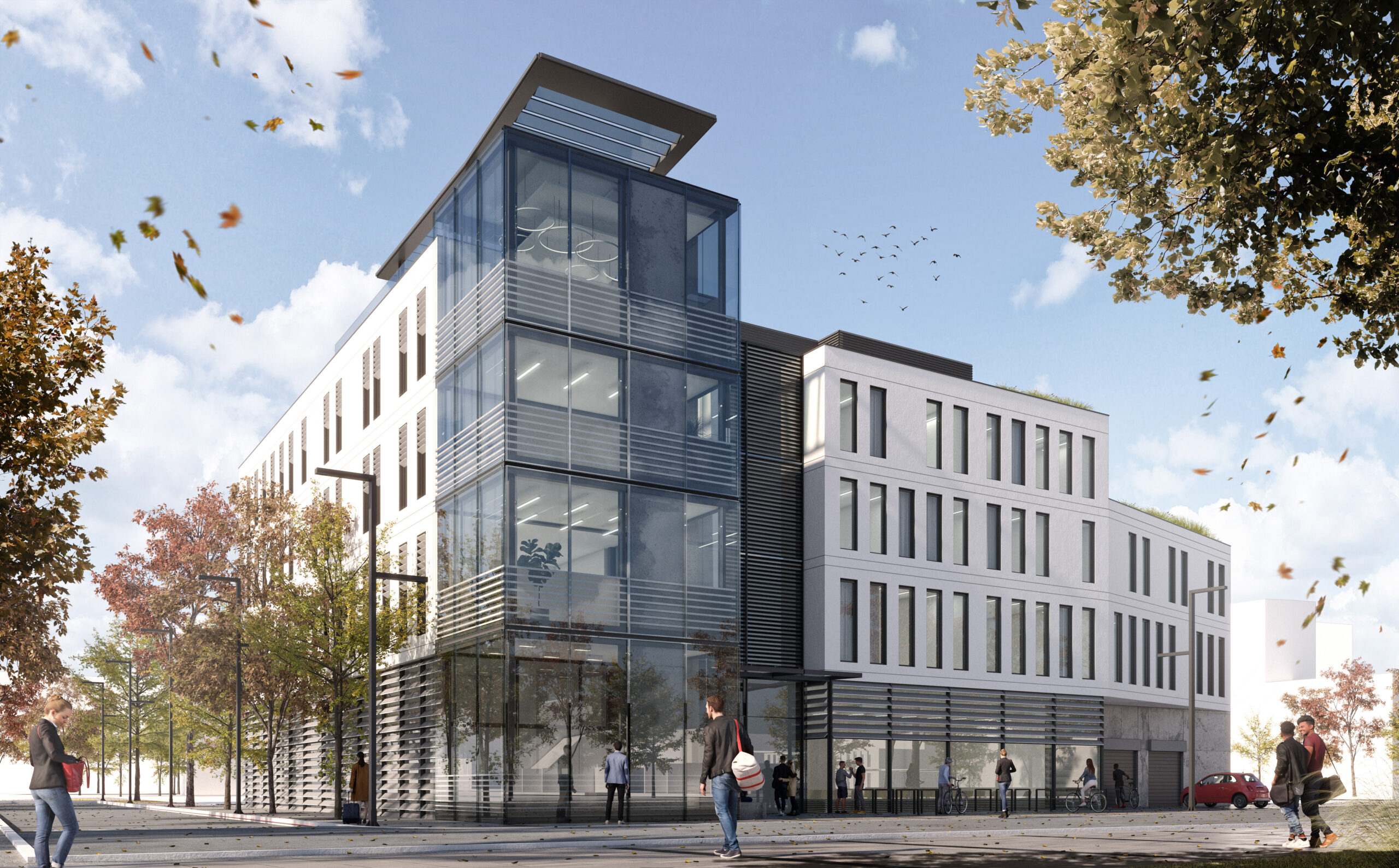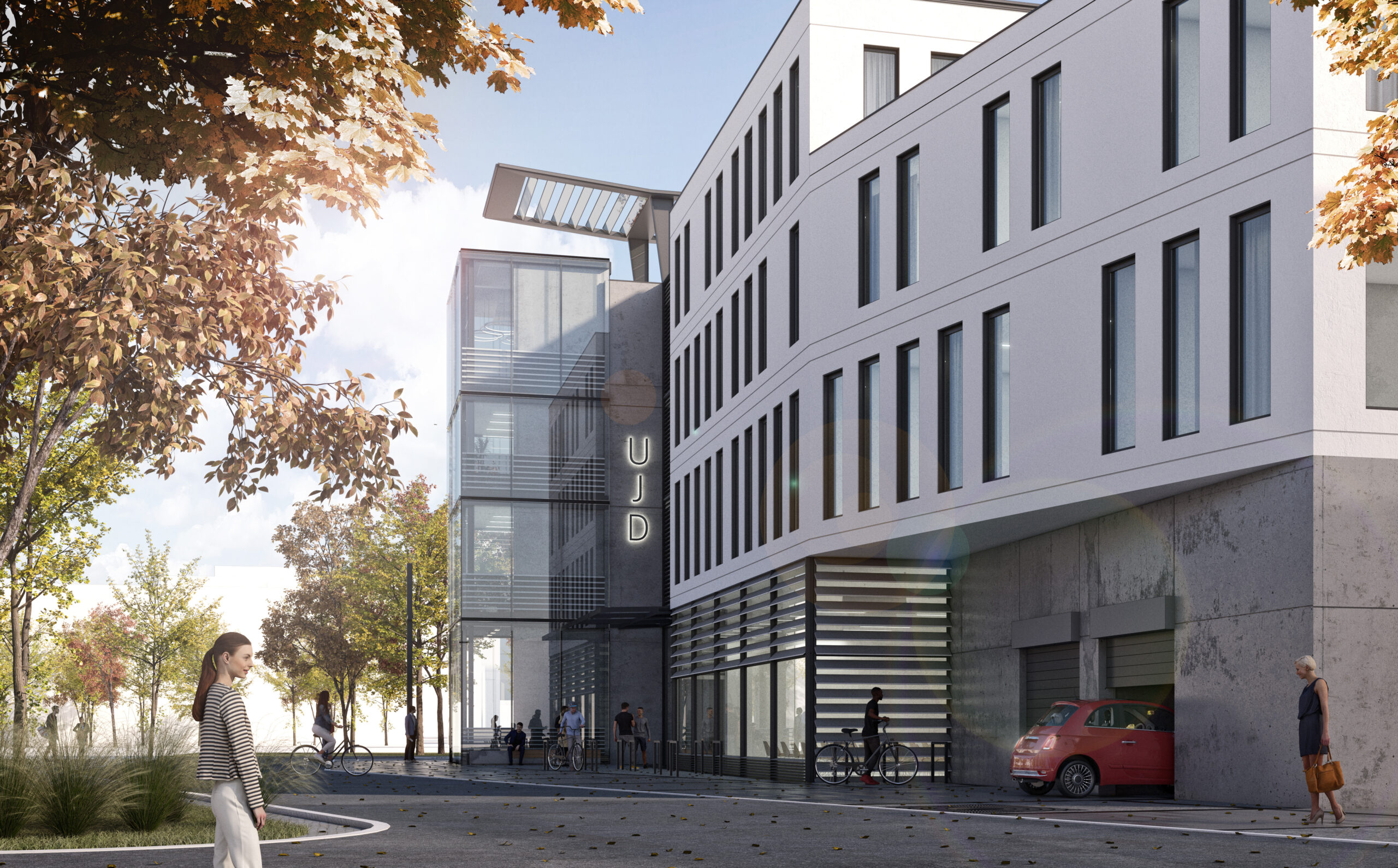 Zagospodarowanie terenu przed budynkiem przewiduje stworzenie parku, który stanie się miejscem wypoczynku i integracji dla studentów oraz pracowników uczelni. Wysoka jakość nawierzchni i elementów małej architektury podkreśla nowoczesny charakter całego założenia.