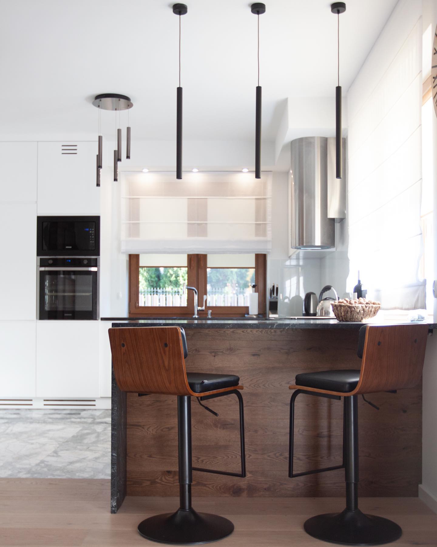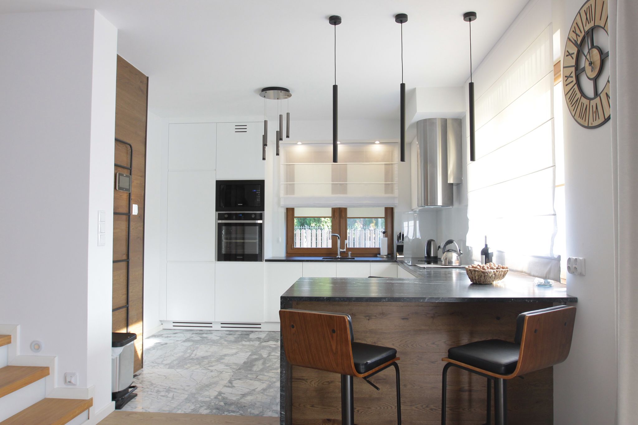 W 2019 roku na warszawskiej Białołęce zrealizowano projekt wnętrza domu w zabudowie bliźniaczej o powierzchni około 135 m². Projekt został zaprojektowany w duchu nowoczesności, łącząc naturalne materiały z minimalistyczną estetyką. Drewno dębowe i granit stanowią bazę, nadając wnętrzu elegancji i trwałości, a kontrastowa kolorystyka brązu, czerni i bieli zapewnia spójność wizualną.