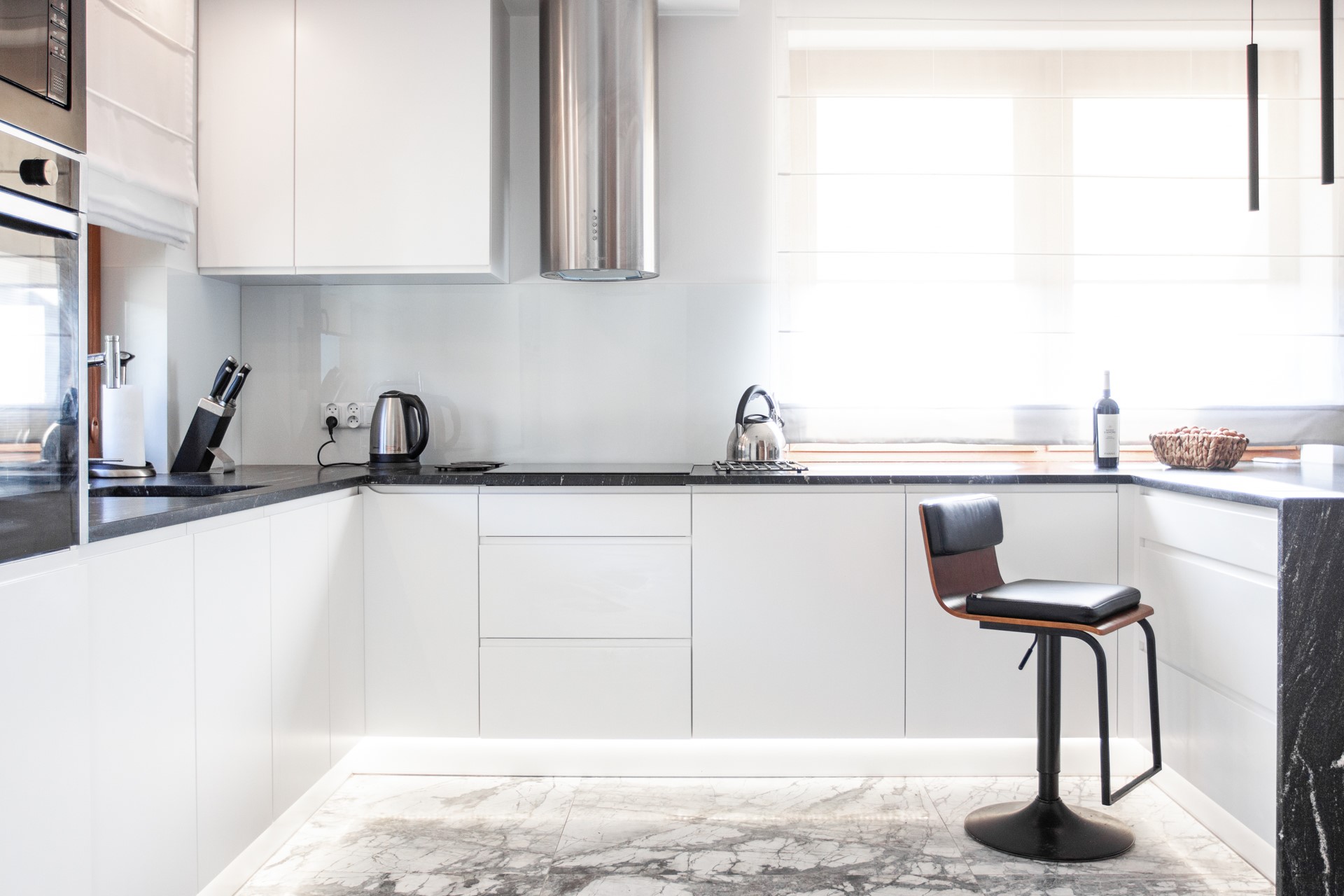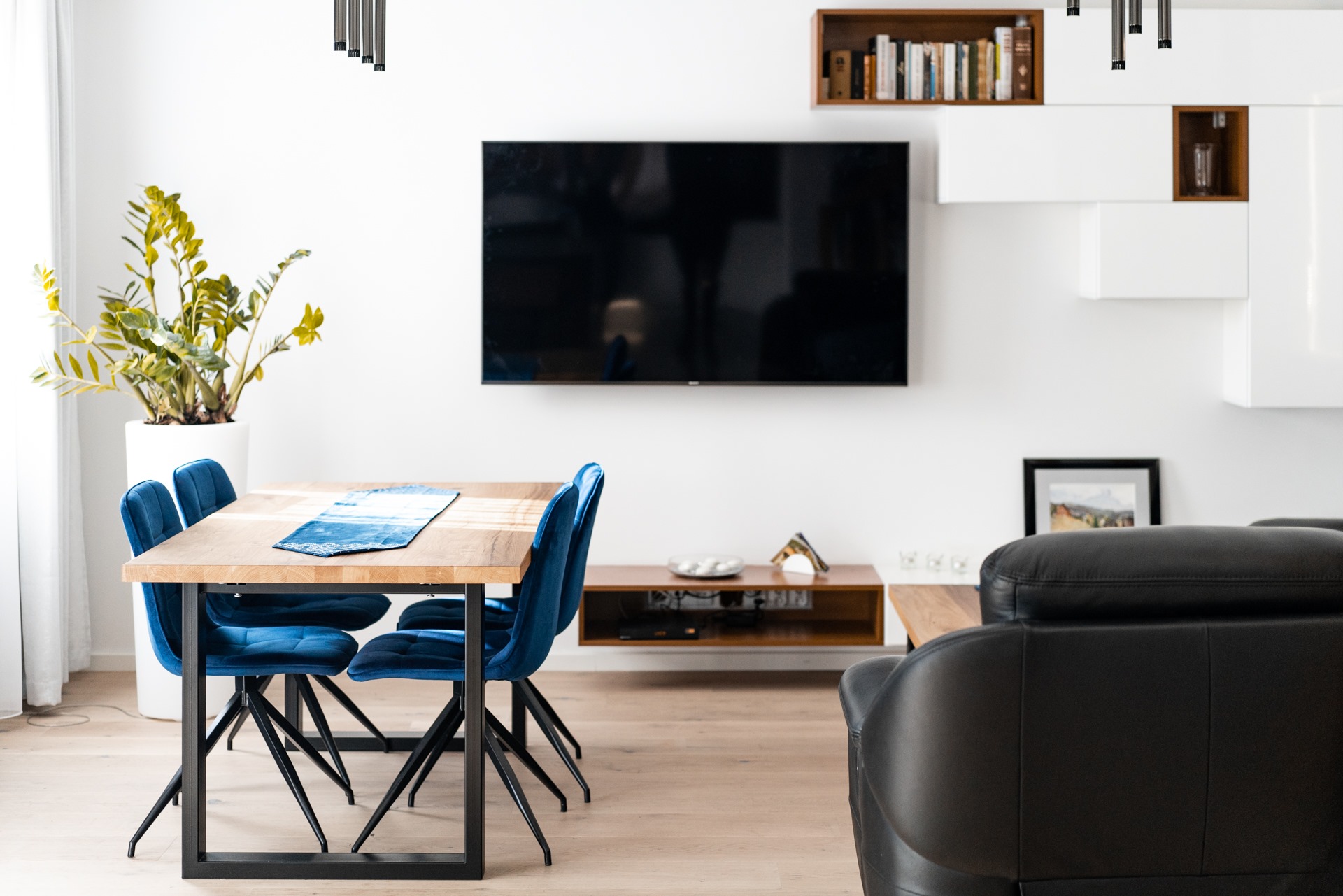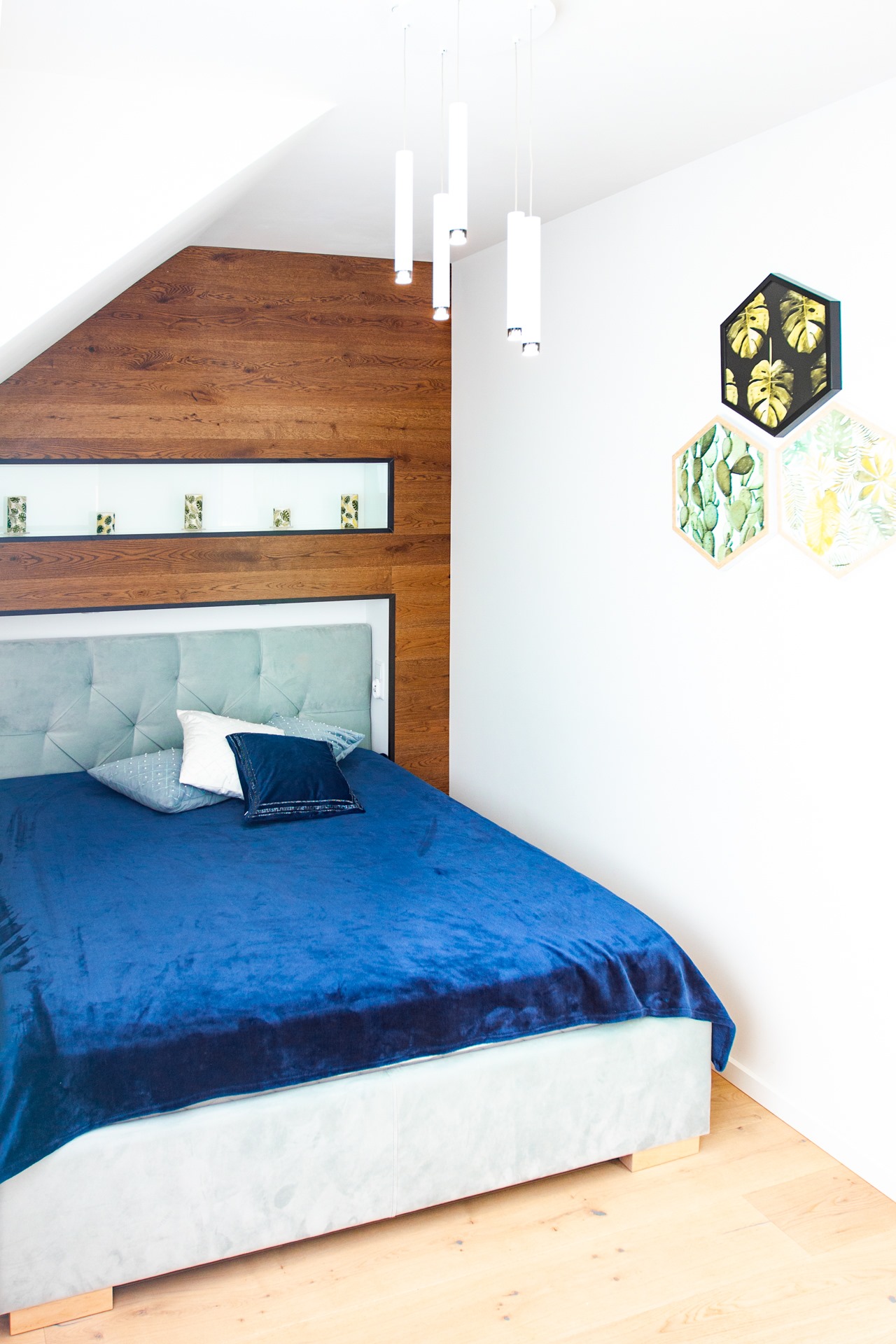 W strefie dziennej dominują proste linie i funkcjonalne rozwiązania, które tworzą otwartą przestrzeń sprzyjającą codziennemu użytkowaniu. Monotonia kolorystyczna została przełamana akcentami w kolorze lazurowym – fotele jadalniane w intensywnym odcieniu niebieskiego dodają wnętrzu wyrazistości i podkreślają jego unikalny charakter. Detale, takie jak subtelne podwieszane oświetlenie czy minimalistyczne uchwyty meblowe, podkreślają nowoczesną stylistykę.