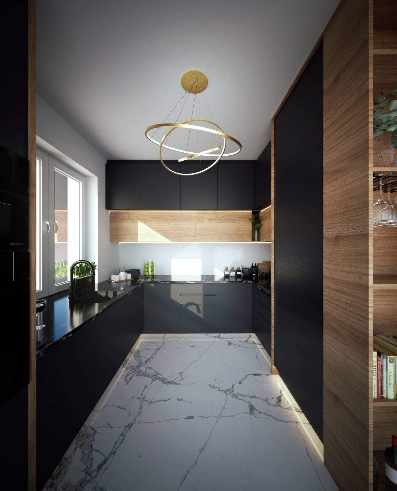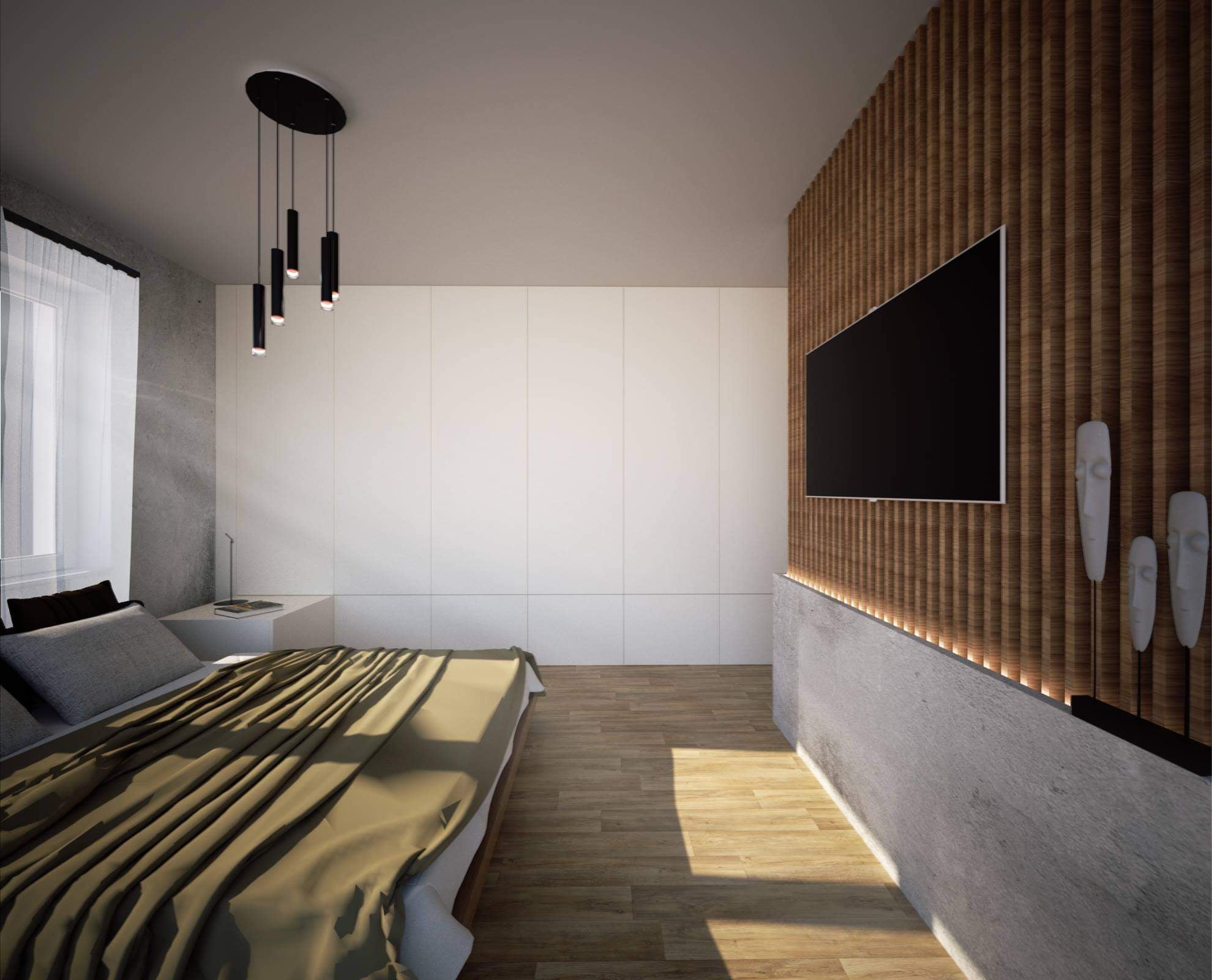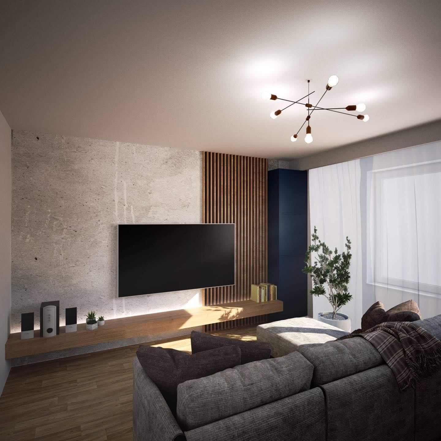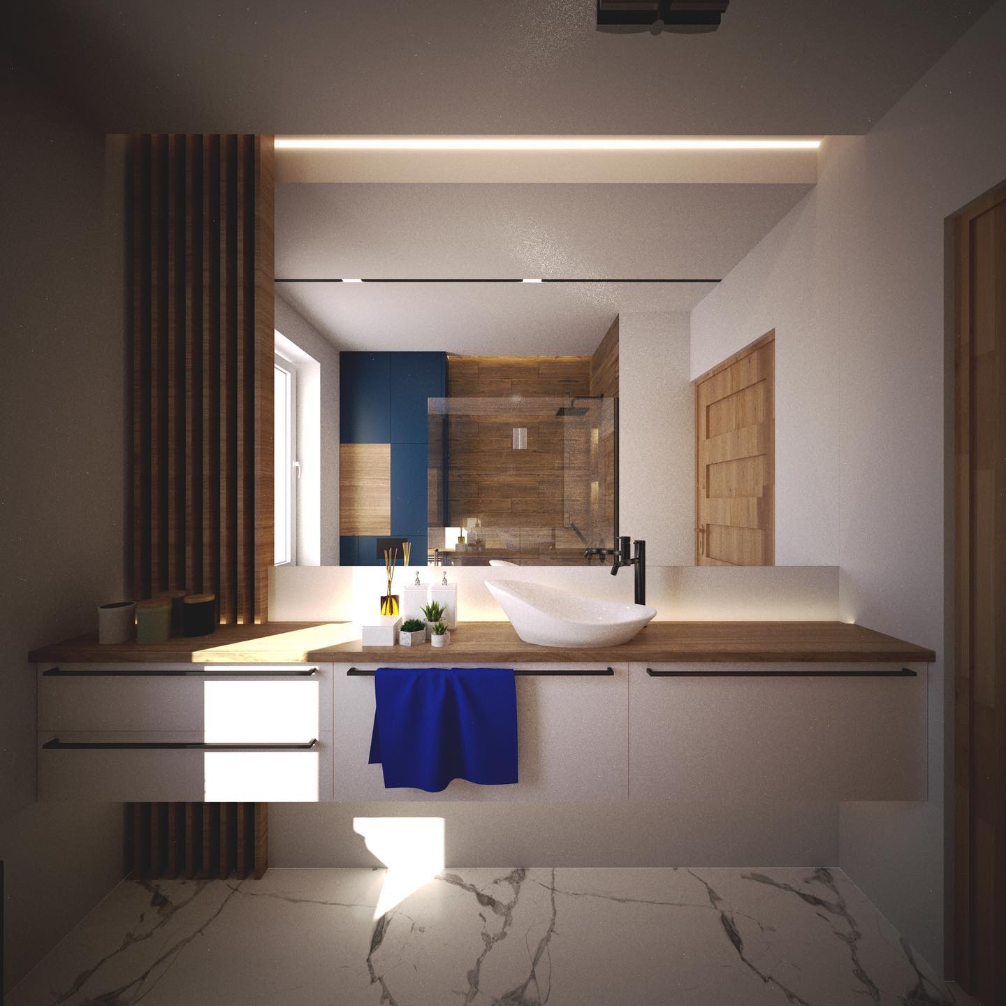 Wnętrza wykończono materiałami wysokiej jakości, łącząc drewno, granitowe blaty, płytki oraz beton architektoniczny. Kolorystyka opiera się na kontrastach – biel, drewno oraz czerń w kuchni tworzą elegancką i ponadczasową bazę, a dodatki w kolorze navyblue nadają wnętrzu wyrazistości. W salonie beton architektoniczny harmonijnie współgra z drewnopodobnymi akcentami, podkreślając nowoczesny charakter projektu.