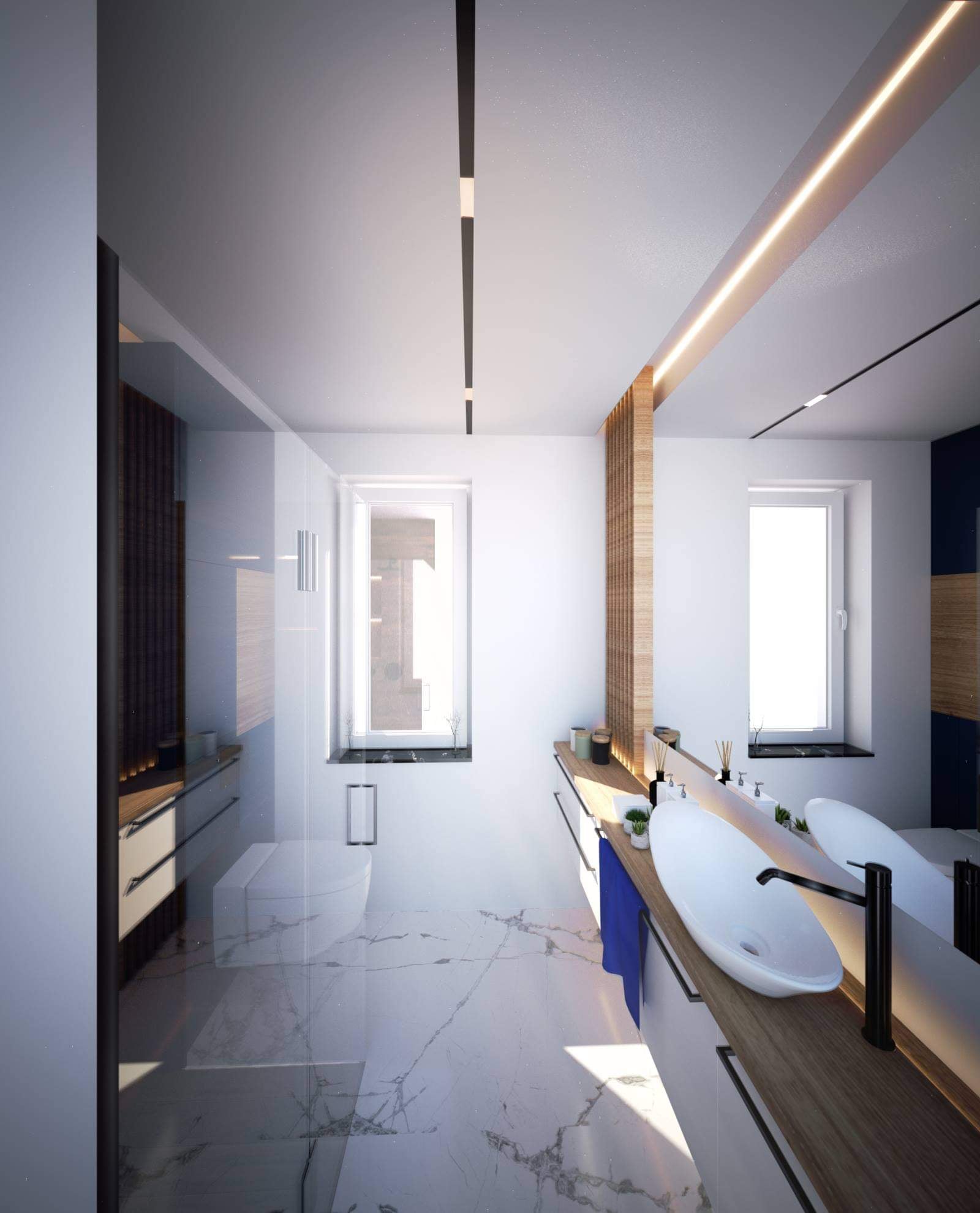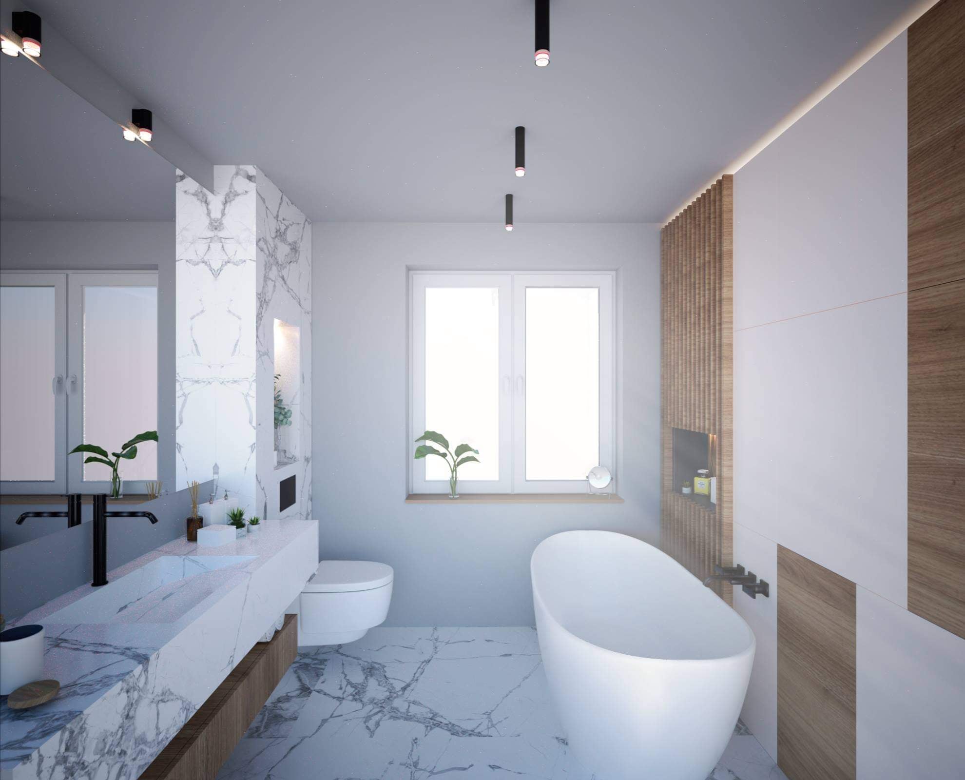 Łazienki utrzymano w jasnych tonacjach, wykorzystując białe płytki i drewno w połączeniu z kontrastującymi czarnymi detalami, które podkreślają minimalistyczny styl. Prosta forma armatury oraz ergonomiczny układ pomieszczeń zapewniają komfort użytkowania.